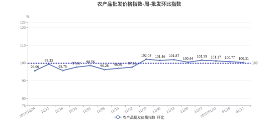 2025年第2周(1月11日—1月17日),北京市农产品批发价格指数环比为100.31,上涨0.31%;同比为98.52,下降1.48%。