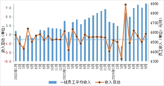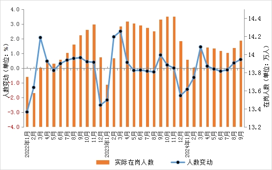 三季度以来,一线员工在岗人数持续3个月上升,9月末人数141556人,较上月末增加826人,较二季度末增加1153人,3个月累计上涨0.8%。从环比情况看,四大行业3升1降,其中:建筑业、服务业和制造业分别上升4.8%、1.1%和0.1%,农业下降0.5%。24类一线岗位16升3平5降,其中超市收银员、钢筋工和电子企业一线操作工涨幅较大,分别为7.1%、5.2%和4.1%;轻工业一线操作工和纺织工业服装缝纫工降幅居前,分别为1.8%和1.1%。
